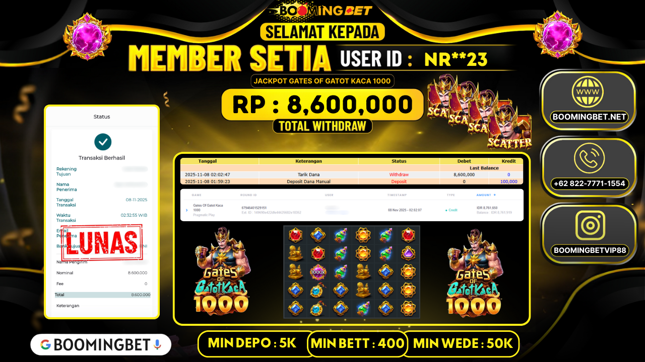 JACKPOT SLOT !! MENANG BESAR DIPERMAINAN GATES OF GATOT KACA 1000 SEBESAR RP.8,600,000 !! BOOMINGBET DIBAYAR SECEPAT KILAT