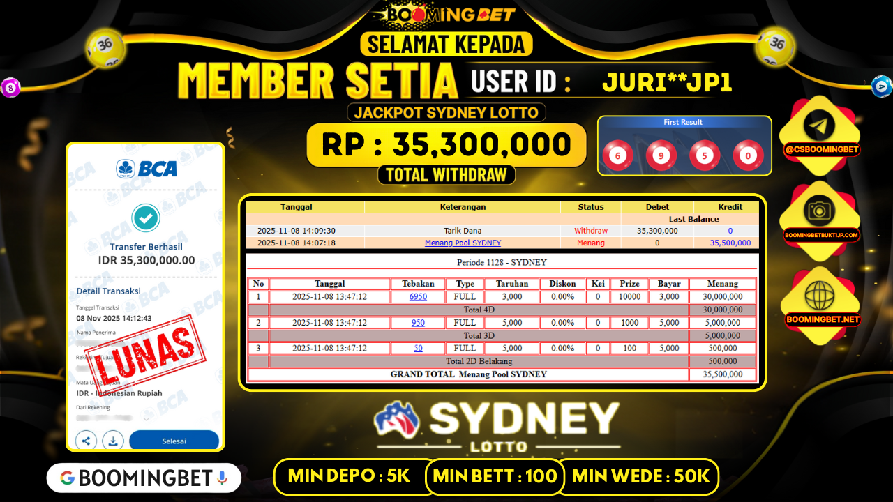JACKPOT TOGEL!! MENANG BESAR DIPASARAN SYDNEY LOTTO SEBESAR RP.35,300,000 !! BOOMINGBET DIBAYAR SECEPAT KILAT