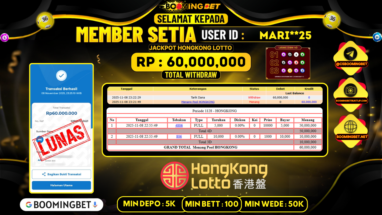 JACKPOT TOGEL!! MENANG BESAR DIPASARAN HONGKONG LOTTO SEBESAR RP.60,000,000 !! BOOMINGBET DIBAYAR SECEPAT KILAT