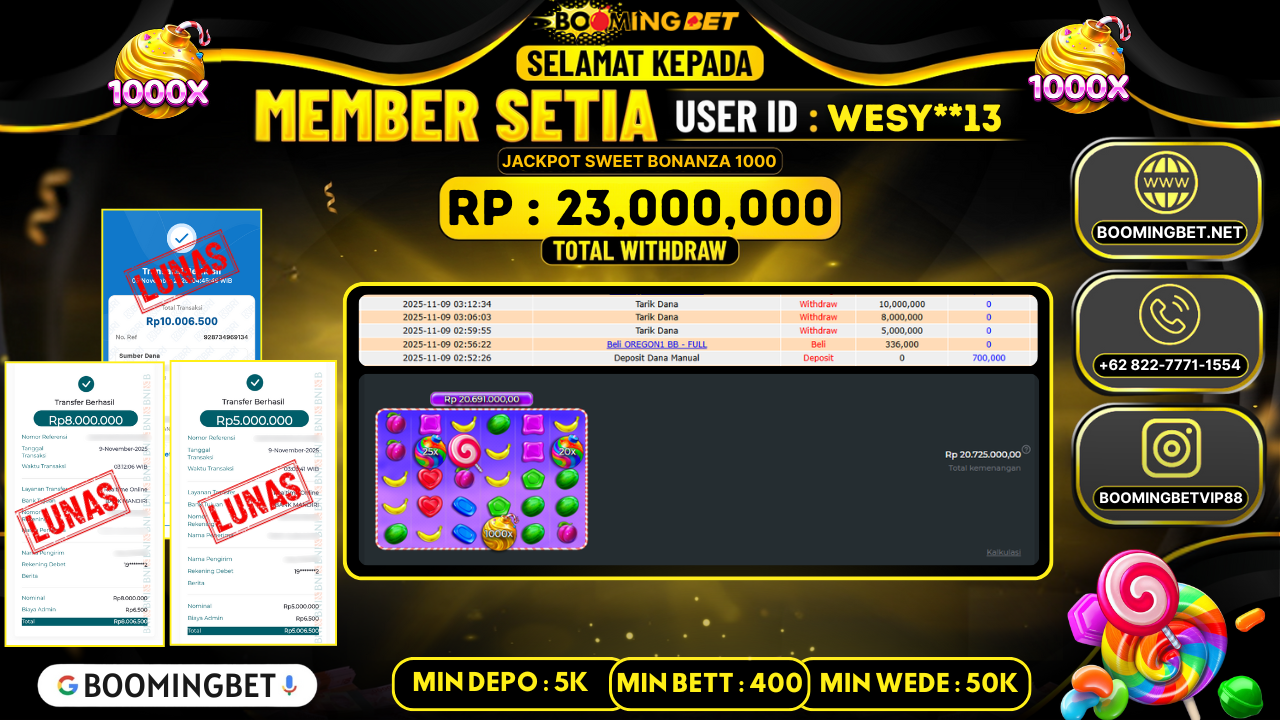 JACKPOT SLOT !! MENANG BESAR DIPERMAINAN SWEET BONANZA 1000 SEBESAR RP.23,000,000 !! BOOMINGBET DIBAYAR SECEPAT KILAT