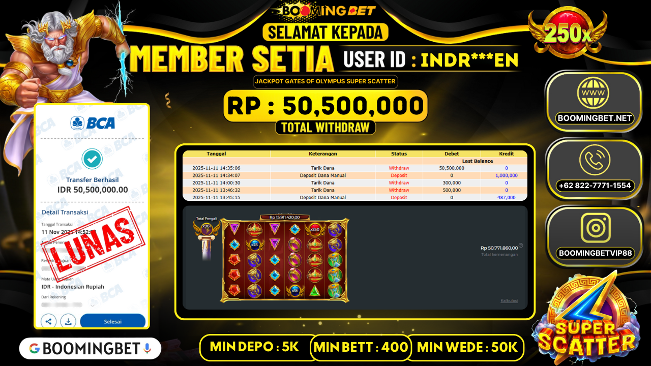 JACKPOT SLOT !! MENANG BESAR DIPERMAINAN GATES OF OLYMPUS SUPER SCATTER SEBESAR RP.50,500,000 !! BOOMINGBET DIBAYAR SECEPAT KILAT