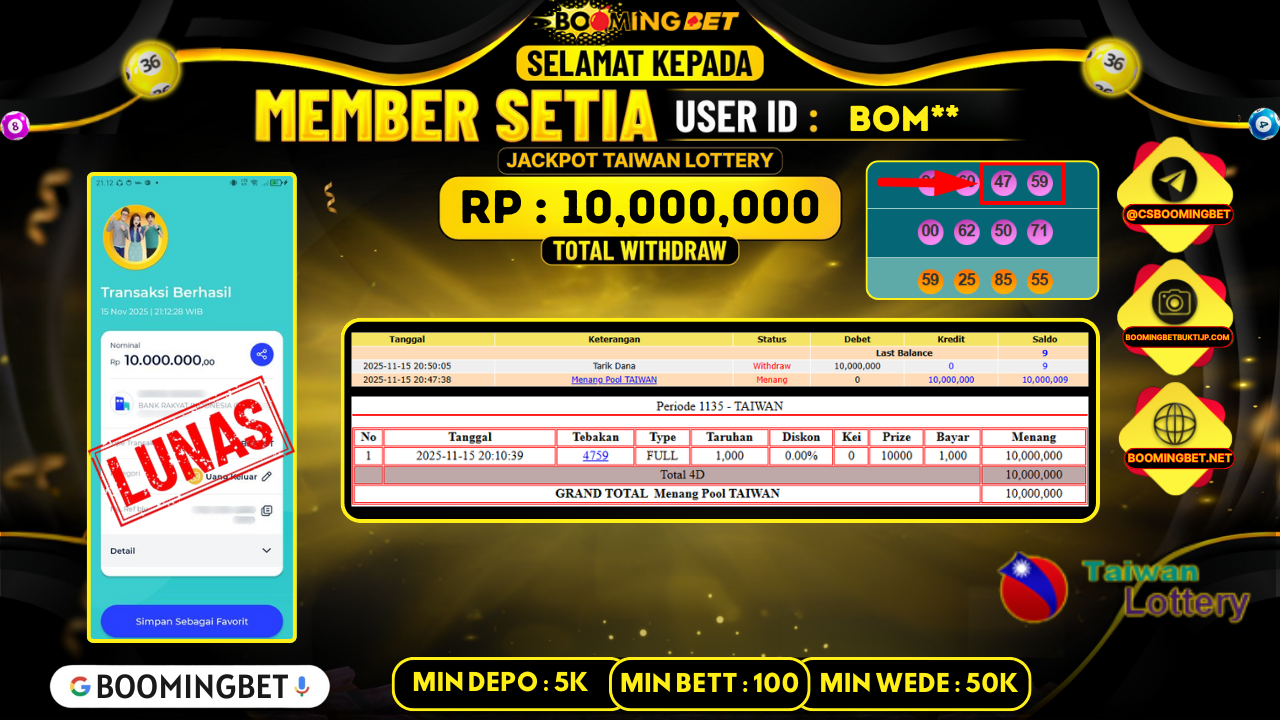 JACKPOT TOGEL!! MENANG BESAR DIPASARAN TAIWAN LOTTREY SEBESAR RP.10,000,000 !! BOOMINGBET DIBAYAR SECEPAT KILAT