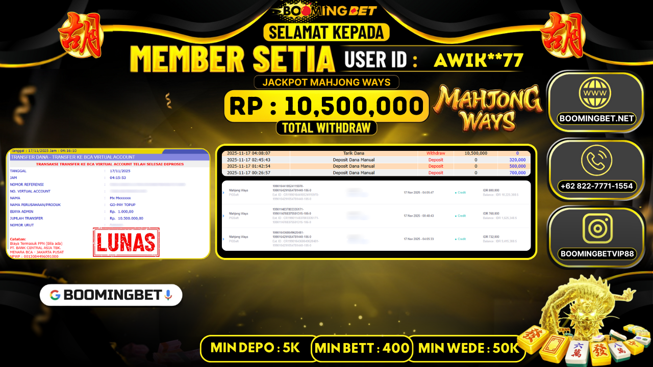 JACKPOT SLOT !! MENANG BESAR DIPERMAINAN MAHJONG WAYS SEBESAR RP.10,500,000 !! BOOMINGBET DIBAYAR SECEPAT KILAT