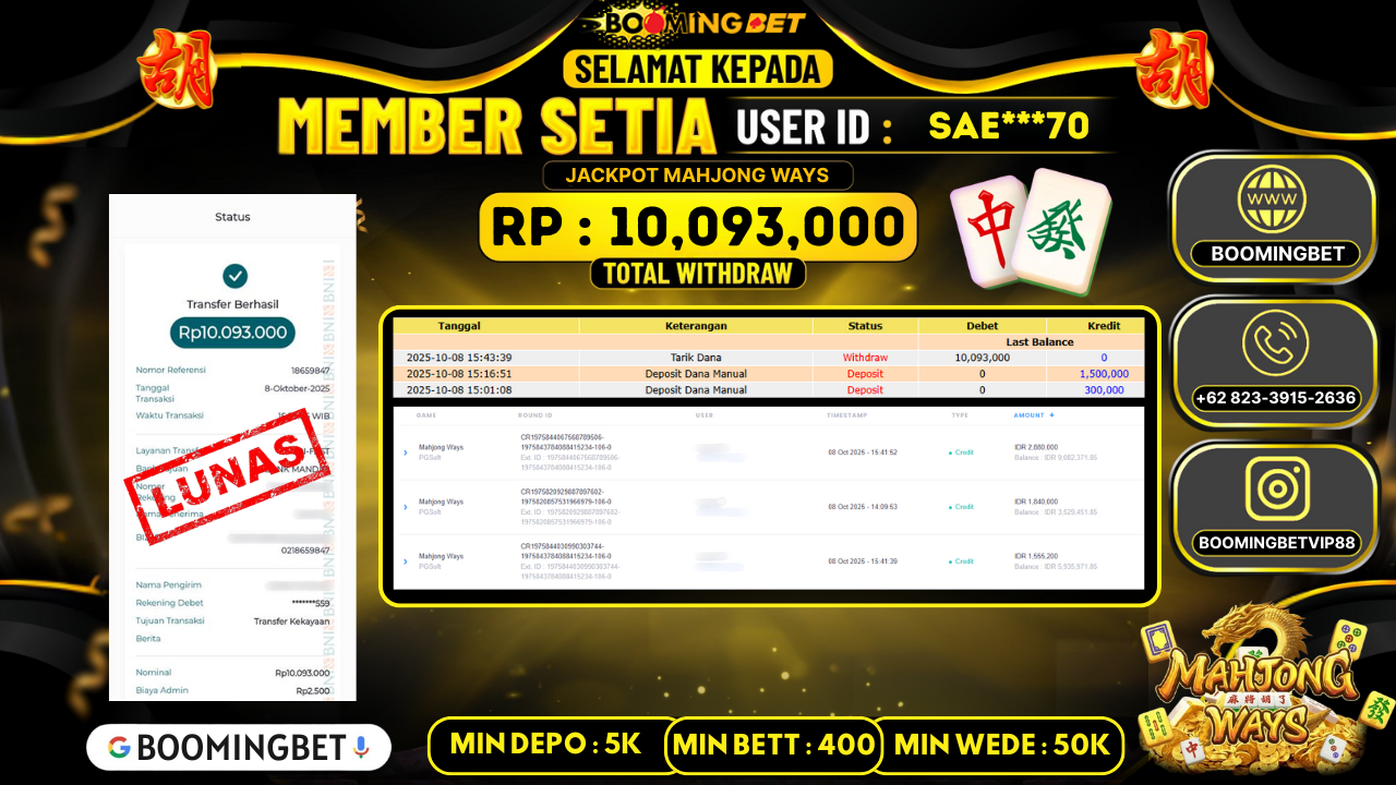 JACKPOT SLOT !! MENANG BESAR DIPERMAINAN MAHJONG WAYS SEBESAR RP.10,093,000 !! BOOMINGBET DIBAYAR SECEPAT KILAT